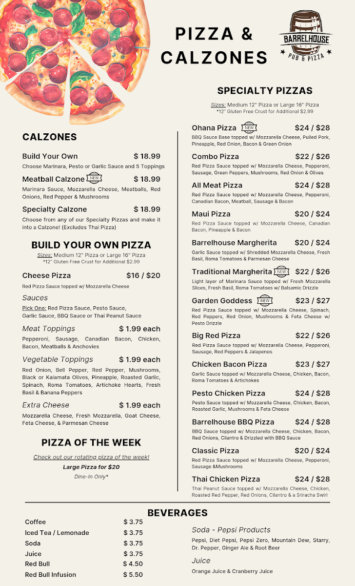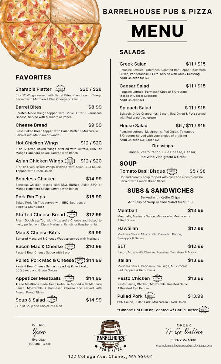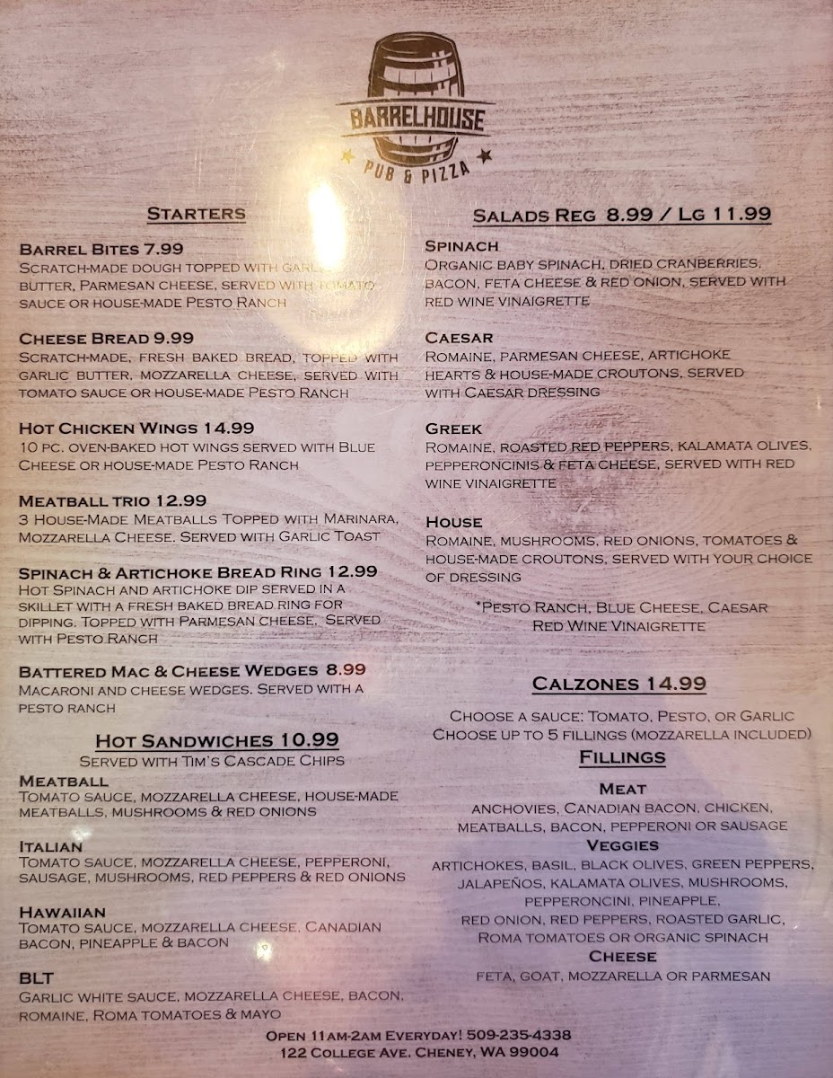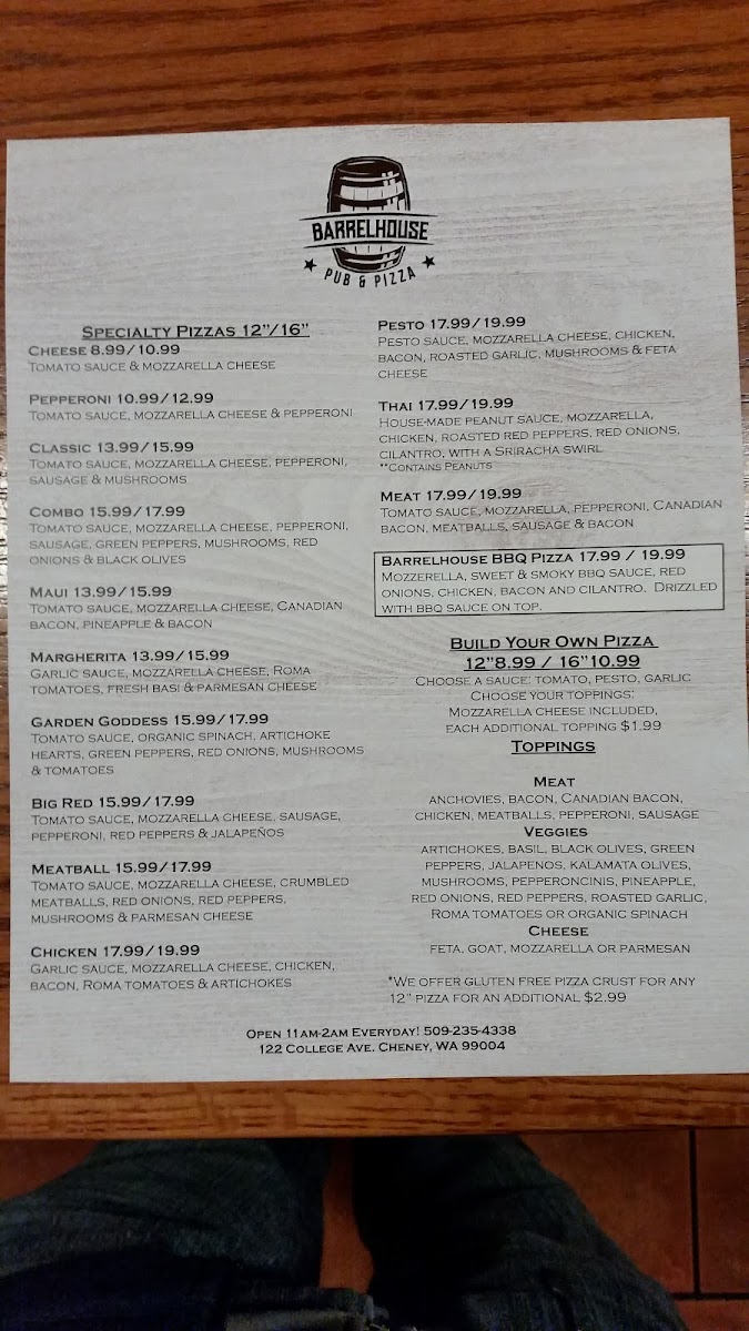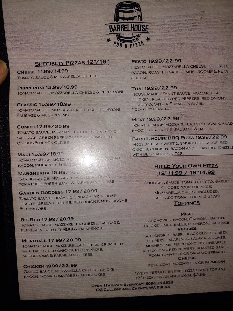 Welcome to Barrelhouse Pub & Pizza, nestled in the heart of Cheney, WA. This charming venue offers a delightful blend of savory dishes and a relaxed atmosphere, perfect for families and friends alike. Renowned for its margherita pizza, which rivals those found in Italy, the quality of the dough and rich marinara sauce truly impresses.
